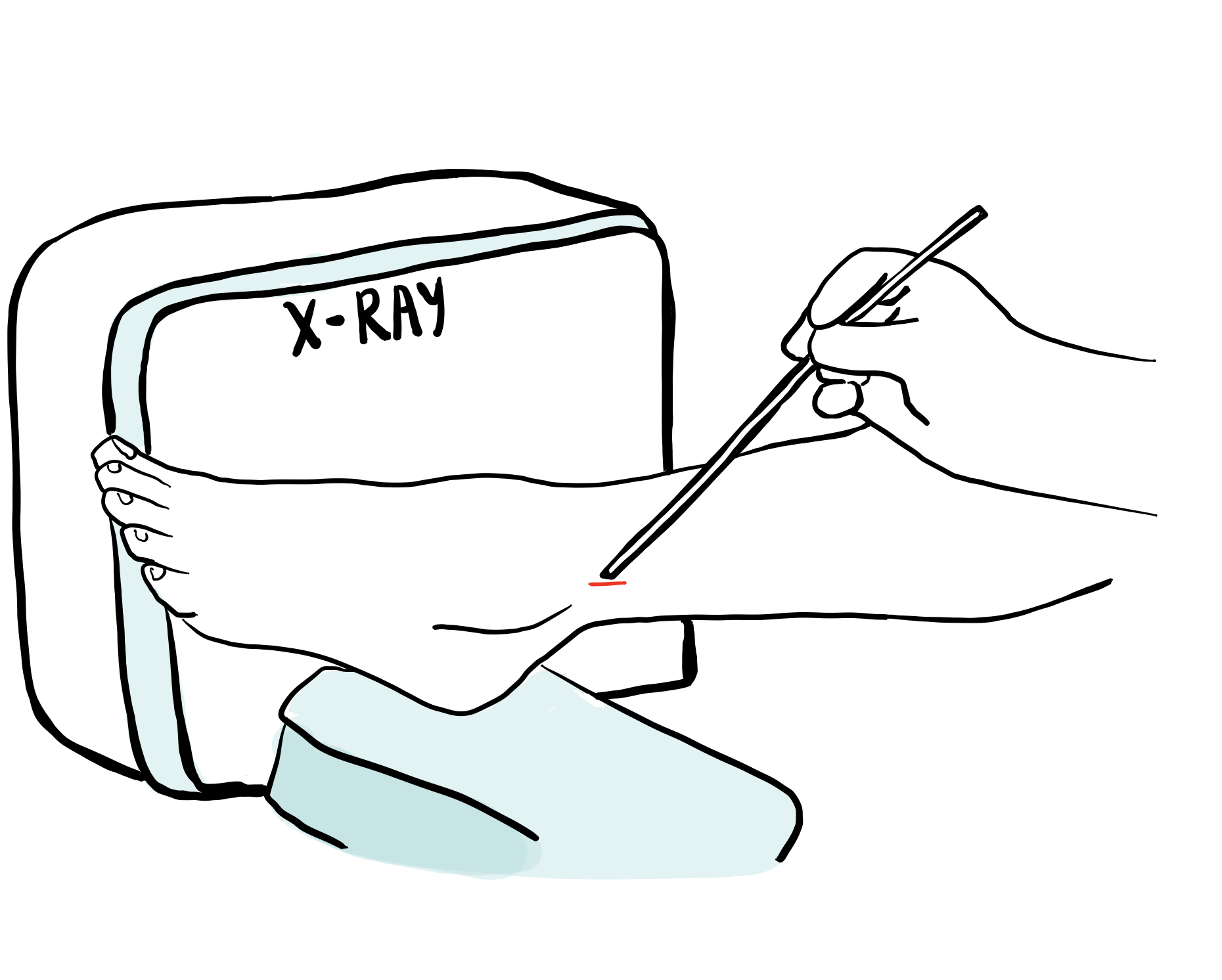 An incision is placed through the old scar and x-ray is used to locate and remove the metal plate and screws.